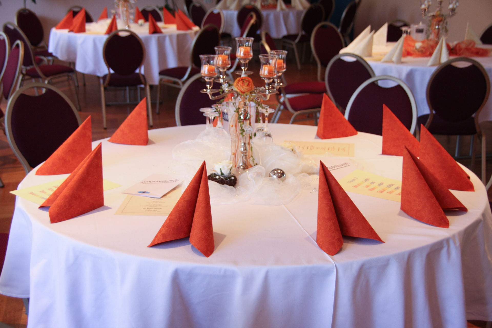 In unserer Vorbesprechung für Ihre Feier haben wir mit Ihnen den passenden Tischplan für Ihre Veranstaltung besprochen. Am Tag Ihrer Veranstaltung stellen wir den Saal so, wie wir es vereinbart haben. Die Tische sind variabel zusammenzustellen. Jeder Tisch ist 1,20 m x 0,80 m groß und wird von uns mit einer weißen Stofftischdecke eingedeckt. Auf Wunsch stellen wir Ihnen auch gerne runde Tische zur Verfügung. Die runden Tische haben einen Durchmesser von 1,60 m. Es können max. 10 Personen an den runden Tischen sitzen. Die weitere Dekoration können Sie gerne selber übernehmen.